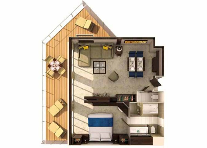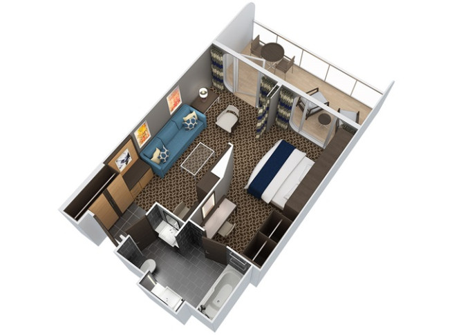 J1 - Junior Suite s veľkým balkónom 25,5 m² + balkón 15 m². Max 2-4 osoby. Výhody Royal Suite Sea Class. 1 800 € 900 € za osobu