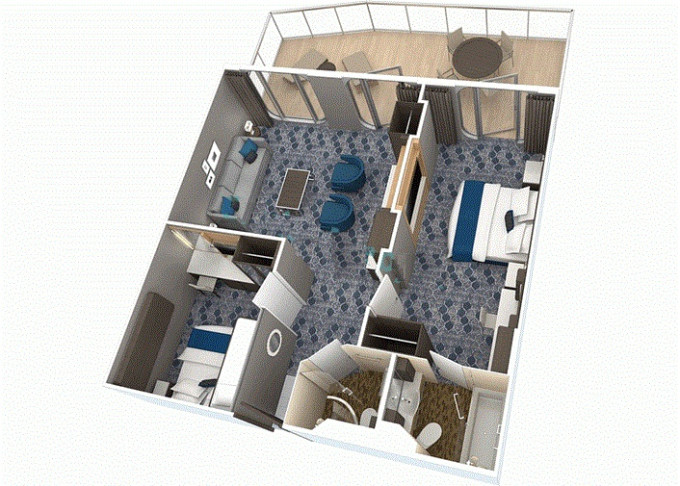 A1 - Suite AquaTheater Spacious / 2 spálne 76,5 m² + balkón 76 m². 8. paluba. Max 8 osôb. Výhody Royal Suite Star Class. 5 602 € 2 801 € za osobu
