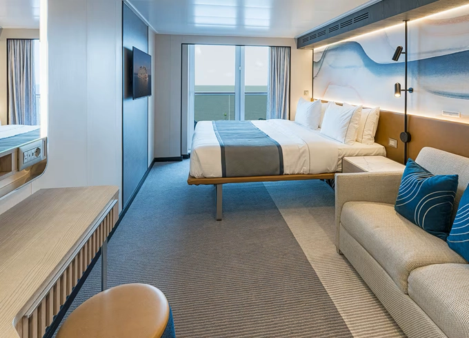 SI - Suite s veľkým balkónom na korme 24 m² / balkón 19 m². 9. paluba - vzadu. Max 2 osoby. Výhody Suite. 8 496 € 4 248 € za osobu